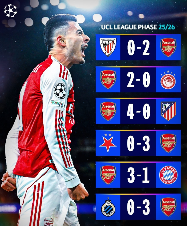 Following Arsenal's dominant 3-0 victory over Club Brugge in the UEFA Champions League Matchday 6, the official Champions League account highlighted the Gunners' flawless performance this season, captioning an image of their results with the question: "Six wins, only one goal conceded. Who can stop Arsenal?"